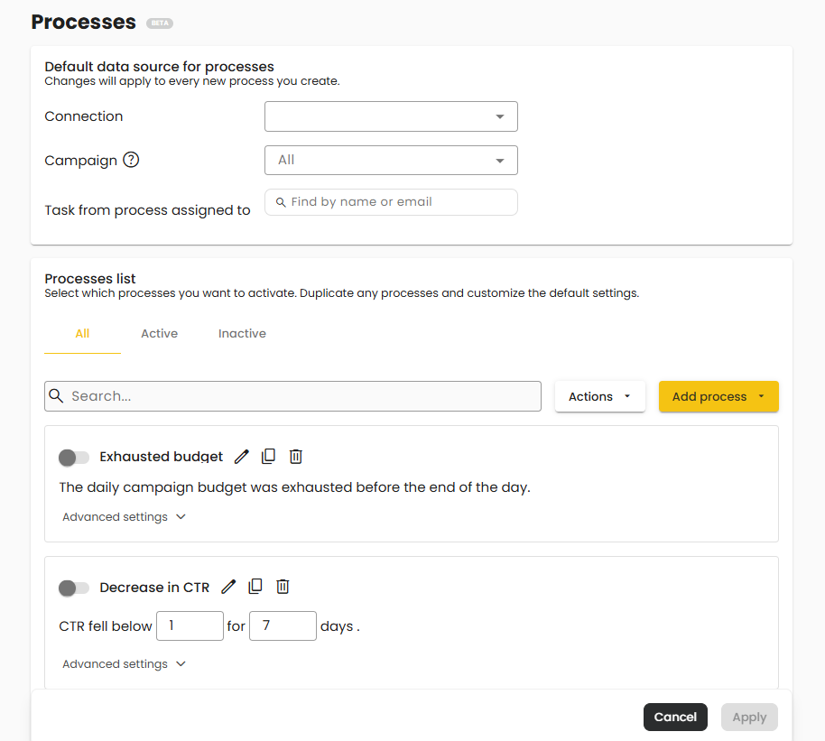 - Activation Condition: Logical rules that determine when the process is triggered, e.g., "CTR drops below 2%.