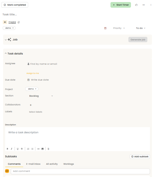 Manual task creation is the process of adding tasks from scratch by the user, without using automation. It is especially useful for non-standard, one-off activities or tasks that require an individual approach, such as preparing a blog post, analyzing an issue, or assigning a specific optimization.