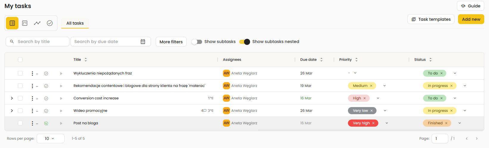 - list view – presents tasks in a table format with the most important parameters, enabling quick filtering, searching, sorting, and bulk management of records,