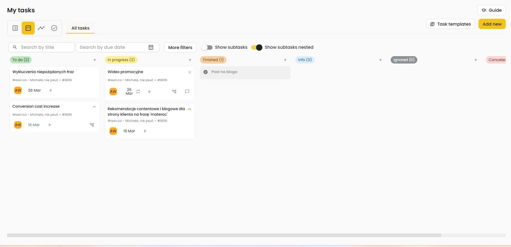 - board view – groups tasks by status, such as New, In Progress, Completed, Information, Ignored, or Cancelled, making it easy to track progress and manage workflow,
