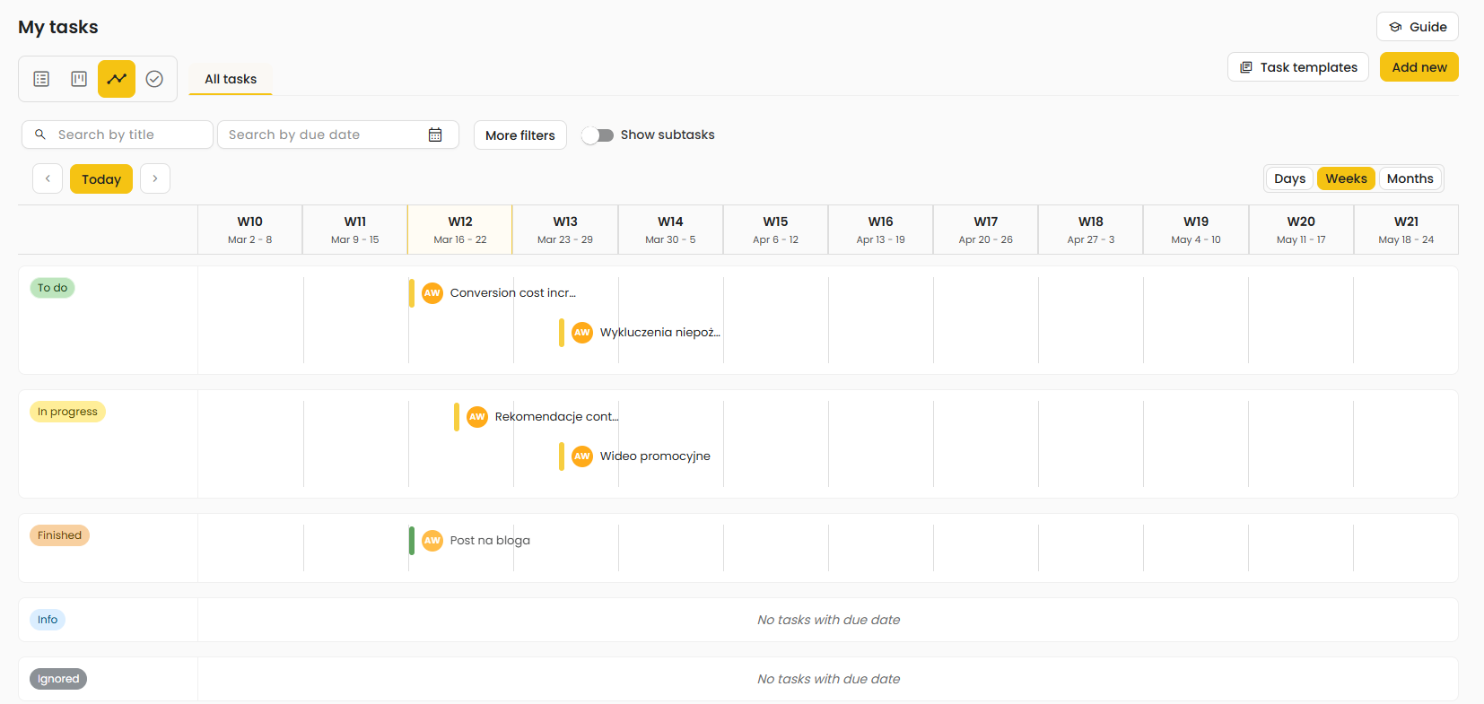 - timeline / schedule view – displays tasks in a time-based layout, for example weekly or monthly, which helps with planning deadlines, analyzing workload, and monitoring execution over time.