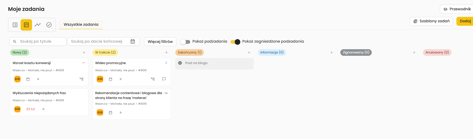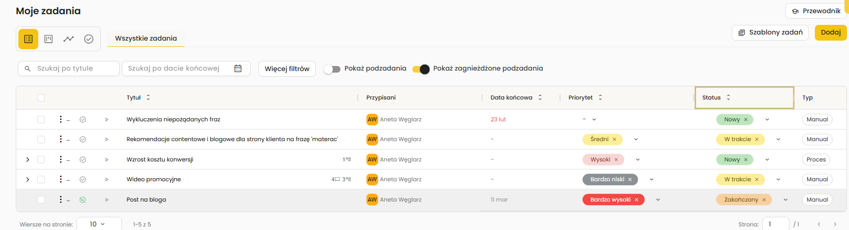- widok listy – pokazuje zadania w formie tabeli z najważniejszymi parametrami, umożliwiając szybkie filtrowanie, wyszukiwanie, sortowanie oraz masowe zarządzanie rekordami,