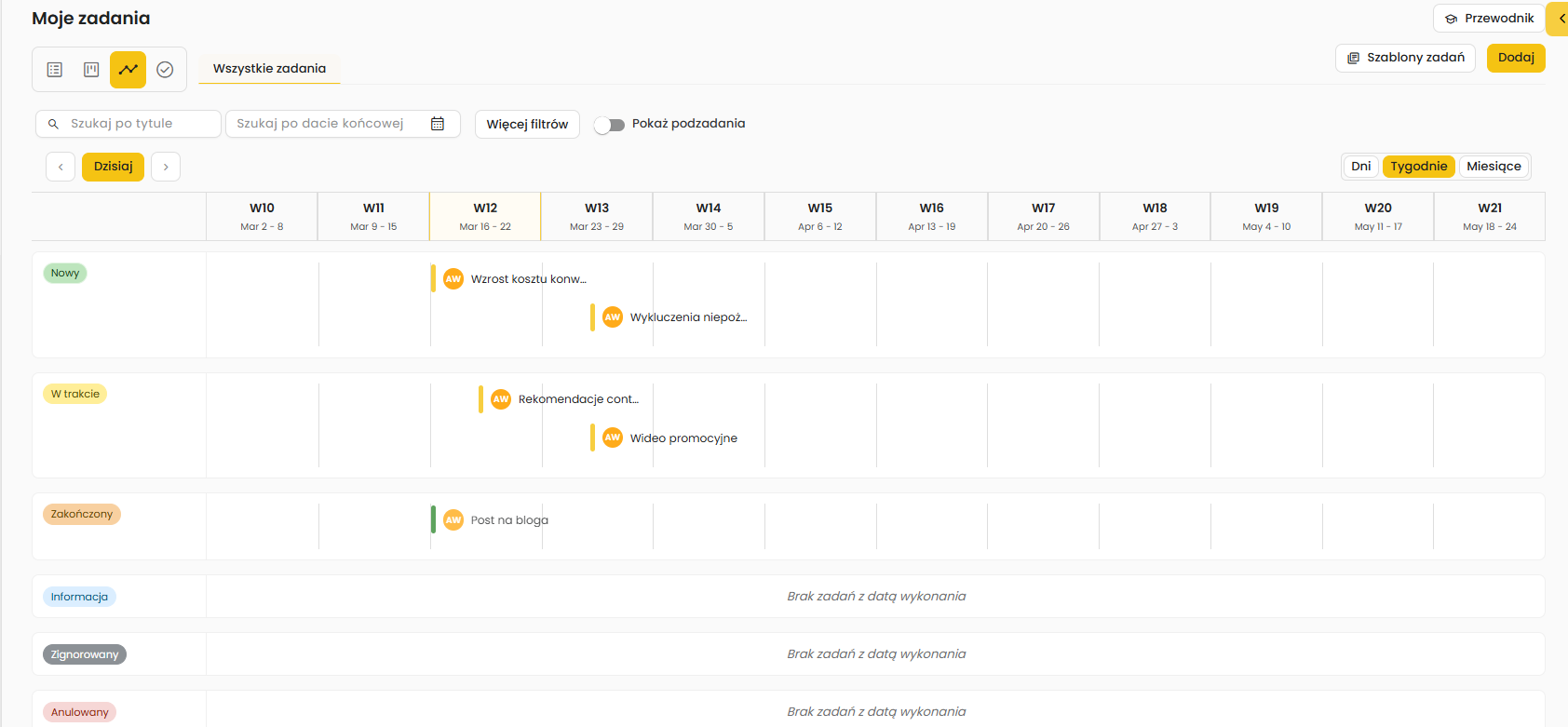 - widok osi czasu / harmonogramu – przedstawia zadania w układzie czasowym, np. tygodniowym lub miesięcznym, co pozwala lepiej planować terminy, analizować obciążenie i kontrolować realizację działań w czasie.