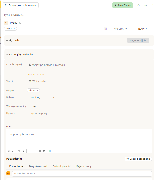 Po utworzeniu zadania użytkownik może także mierzyć czas pracy, dodawać komentarze, wysyłać wiadomości e-mail w ramach zadania, śledzić całą aktywność oraz prowadzić rejestr pracy. Dzięki temu task staje się centralnym miejscem do zarządzania realizacją, komunikacją i monitorowaniem postępu.
