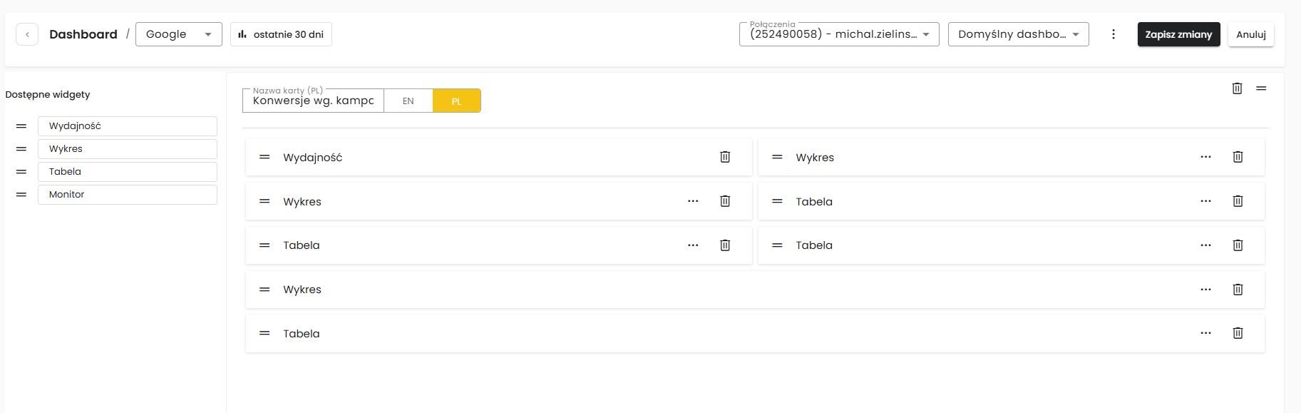 Dashboard to interaktywna przestrzeń, która umożliwia wizualne przedstawienie wyników pochodzących z podpiętych źródeł danych, takich jak Google, Facebook, czy Microsoft. Prezentowane informacje są uporządkowane w formie wykresów, tabel, wskaźników KPI (Key Performance Indicators) i innych elementów wizualnych, które ułatwiają interpretację danych.
